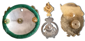 Las primeras insignias tenían dos tipos de cierres: las de botón y las de tornillo. Las de botón mantenían la idea básica de colocarse en las chaquetas o americanas en un ojal para botón y han sufrido pocos cambios. El más vistoso es alargar la forma para facilitar su colocación, y girar la insignia para dificultar su pérdida.