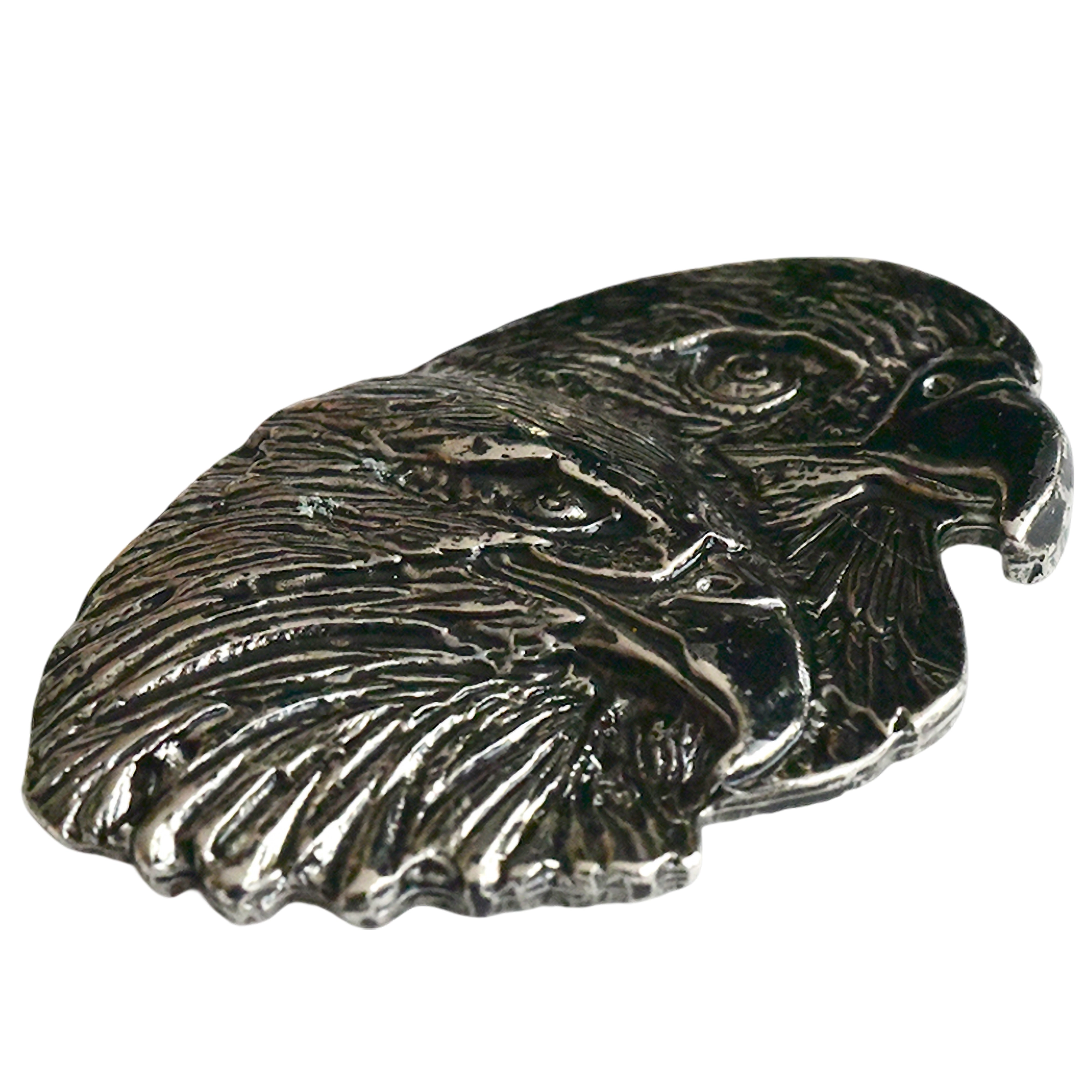 Este pin presenta dos cabezas de águila en relieve con detalles de plumaje y pico, acabado metálico plateado.