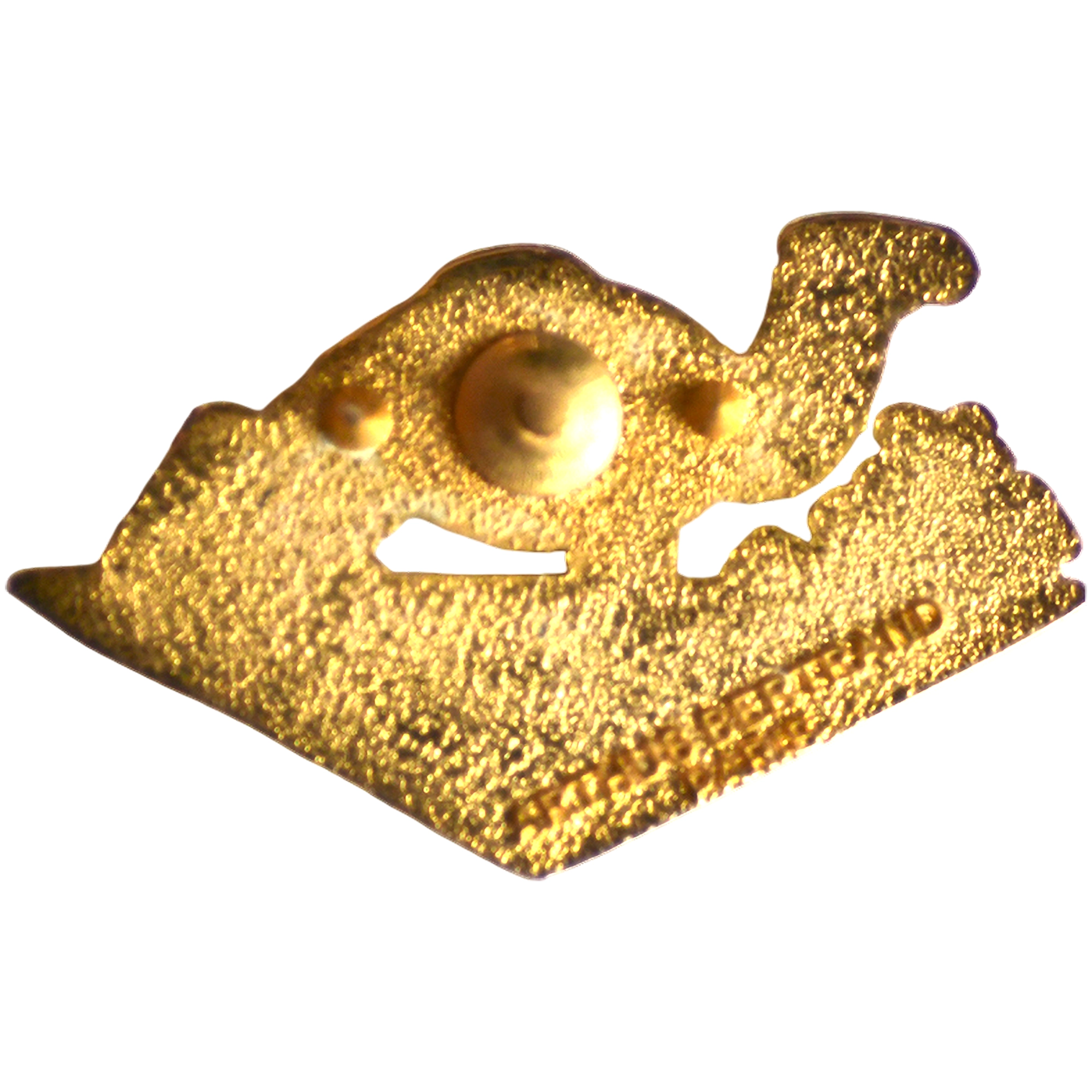 Este pin presenta un camello dorado en primer plano con pirámides y palmeras en relieve, estilo Egipto.