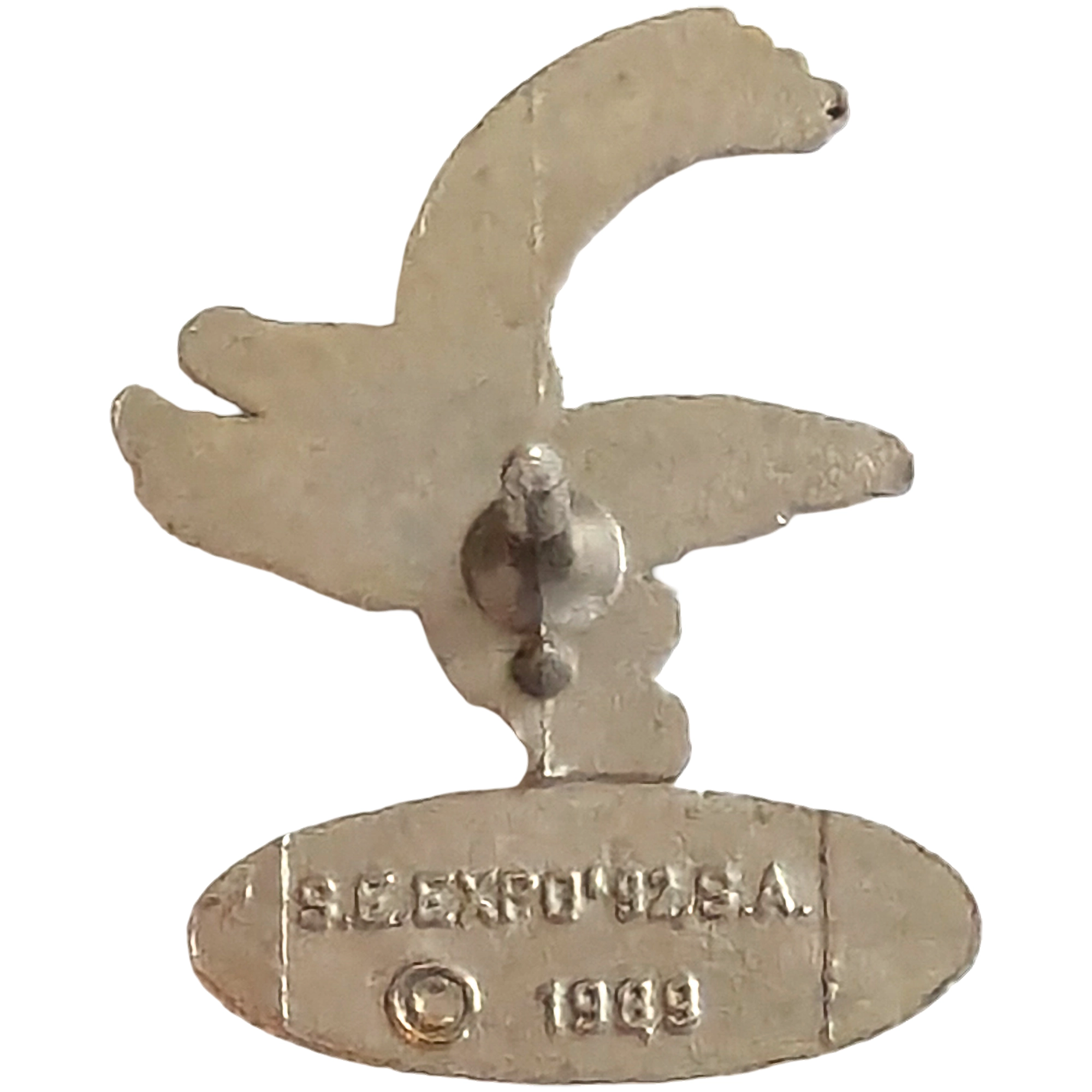 Este pin presenta a Curro, mascota de la Expo 92 Sevilla; pájaro blanco con cresta arcoíris y pico tricolor.