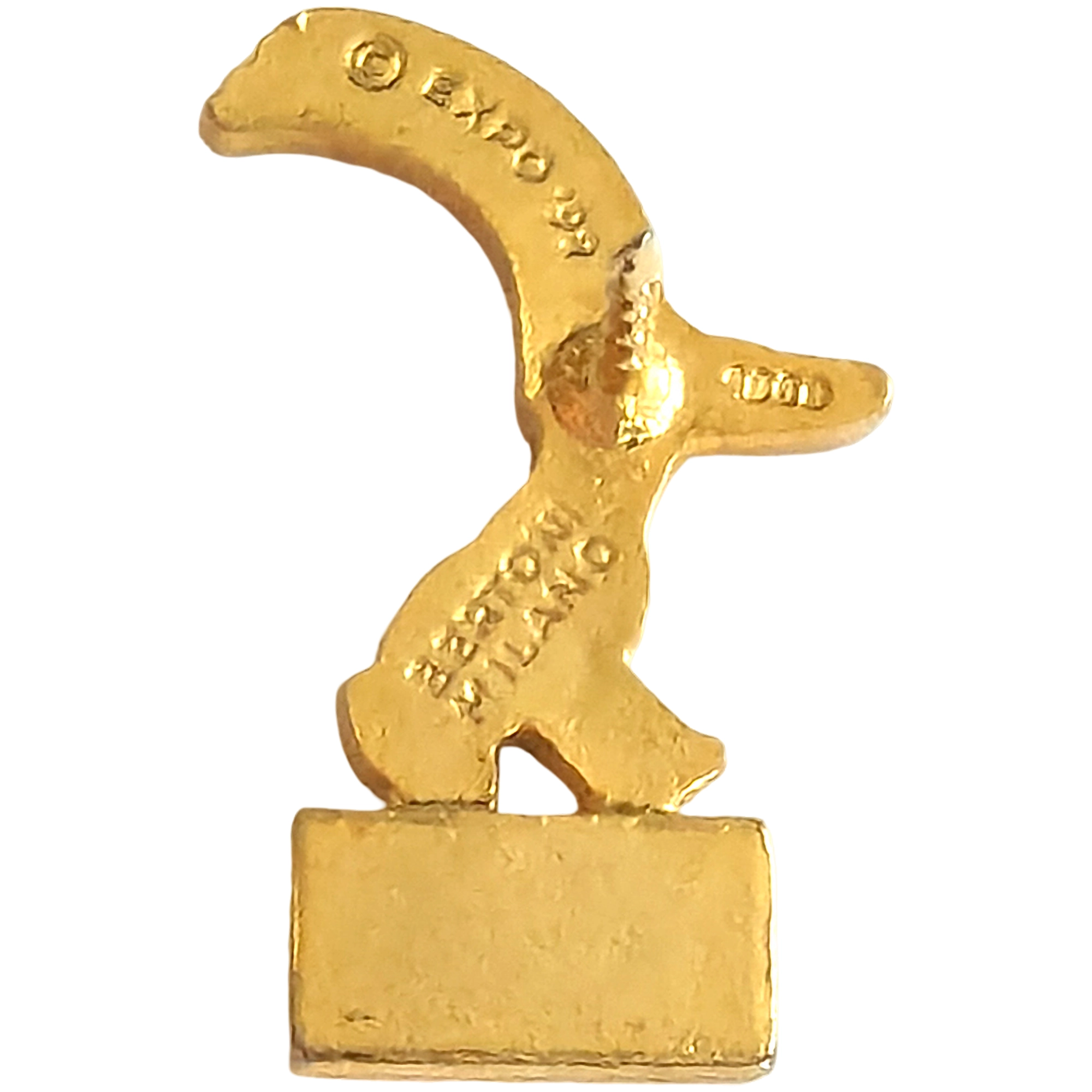 Este pin presenta a Curro, mascota de la Expo 92 de Sevilla, con cresta multicolor sobre la bandera de Portugal con esfera armilar.