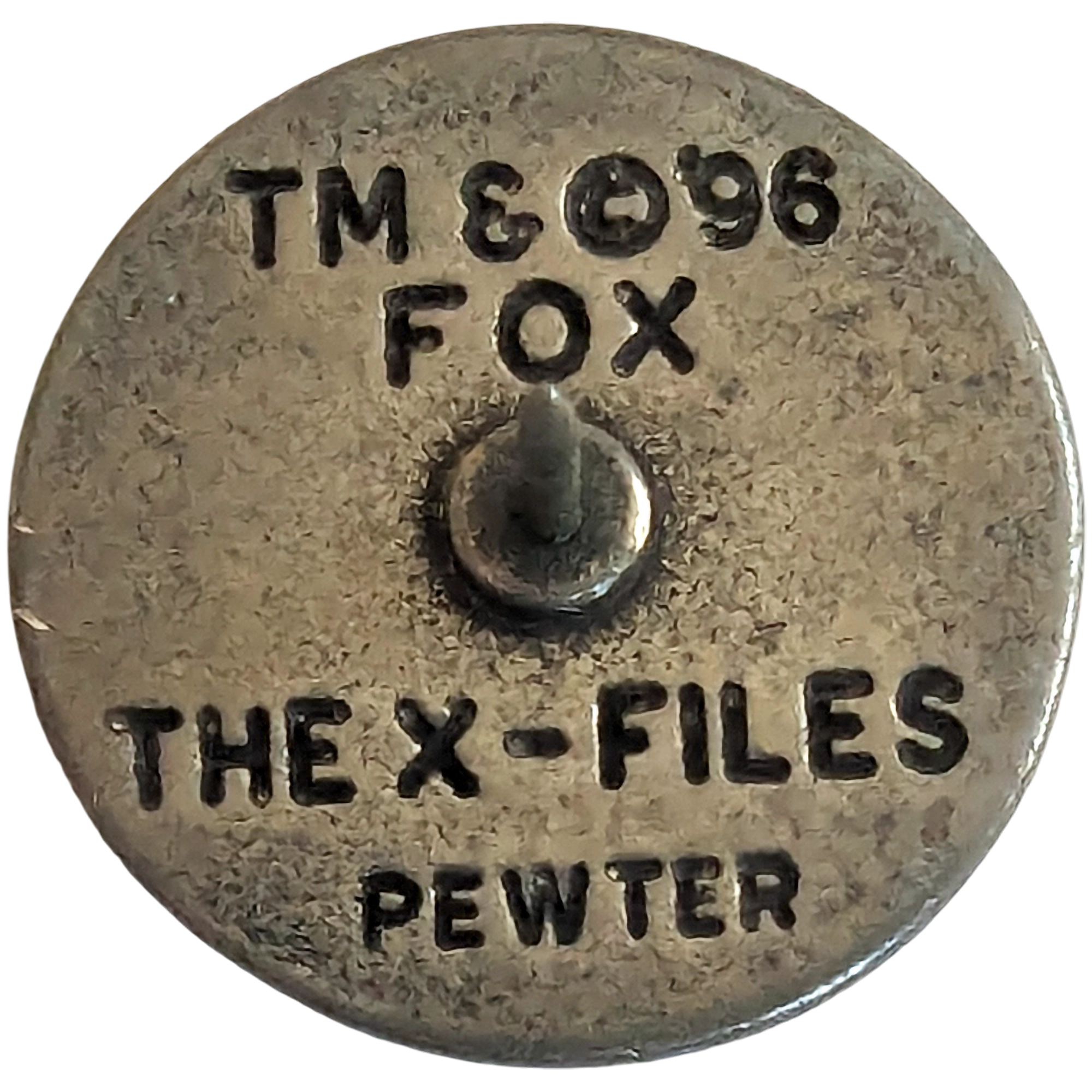 Este pin presenta una X rústica en relieve sobre disco de metal con acabado bronce envejecido. Pin sin identificar.