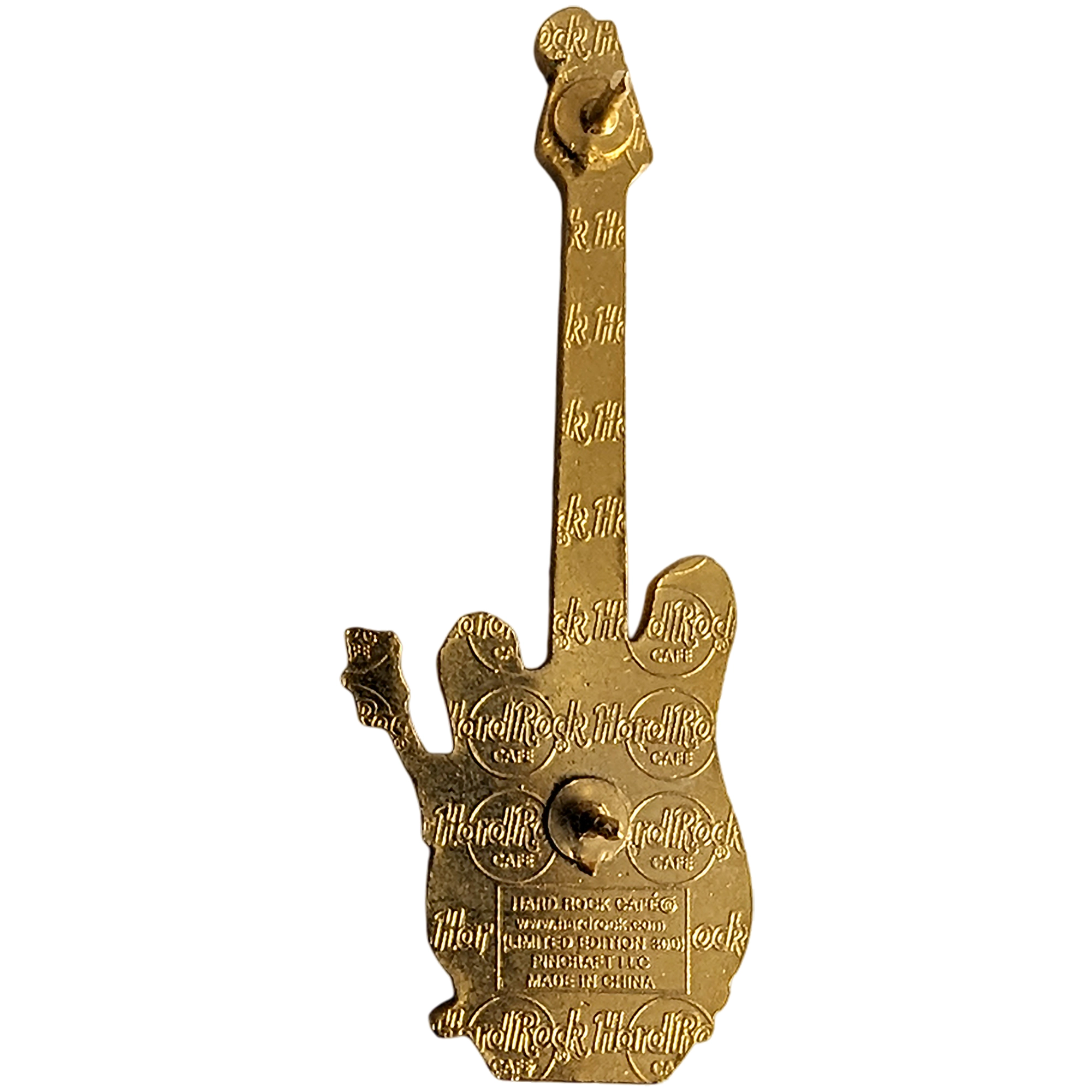 Este pin presenta una guitarra Hard Rock Cafe Fukuoka con mástil COUNTDOWN, tragamonedas '200', llamas, dados y monedas.
