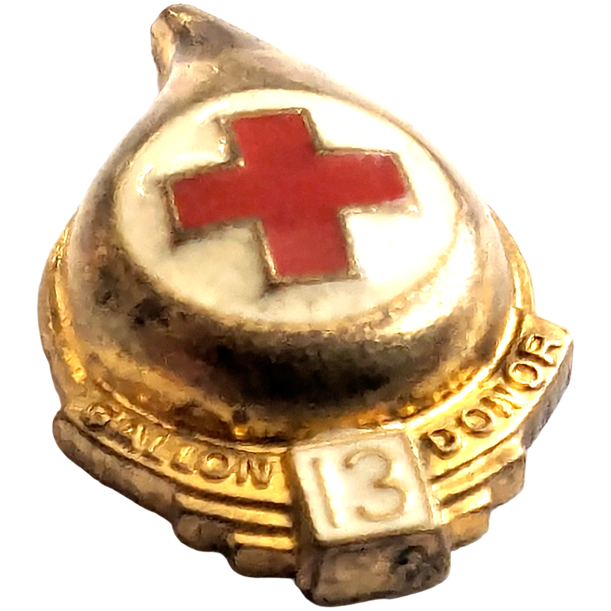 Este pin presenta una gota dorada con cruz roja en fondo blanco y el número 13, distinción de donante de Cruz Roja.