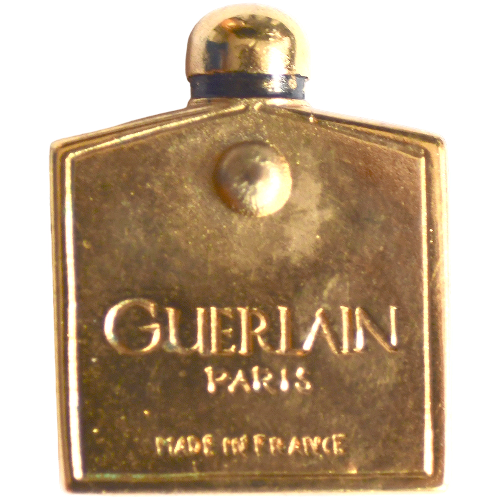 Este pin presenta un frasco miniatura de Guerlain en esmalte ámbar y relieve metálico, tapón redondeado.