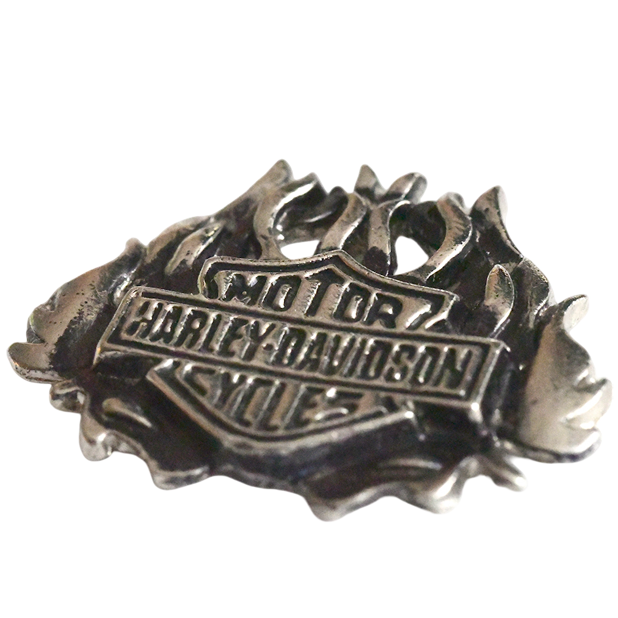 Este pin presenta el escudo clásico Harley-Davidson con barra y llamas, acabado metálico envejecido y relieve marcado.