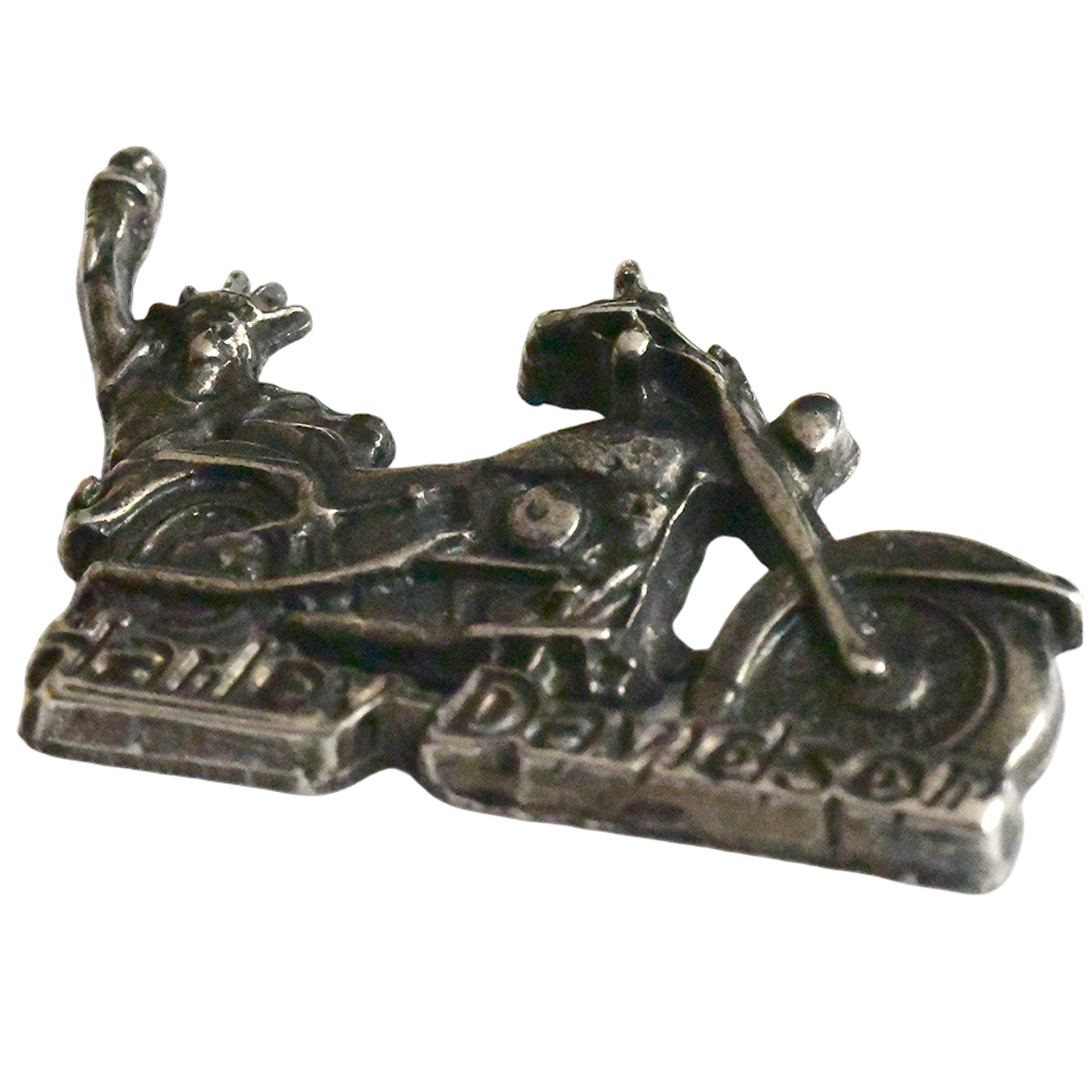 Este pin presenta la Estatua de la Libertad montada en una moto Harley-Davidson, detalle metálico y logo Harley-Davidson.