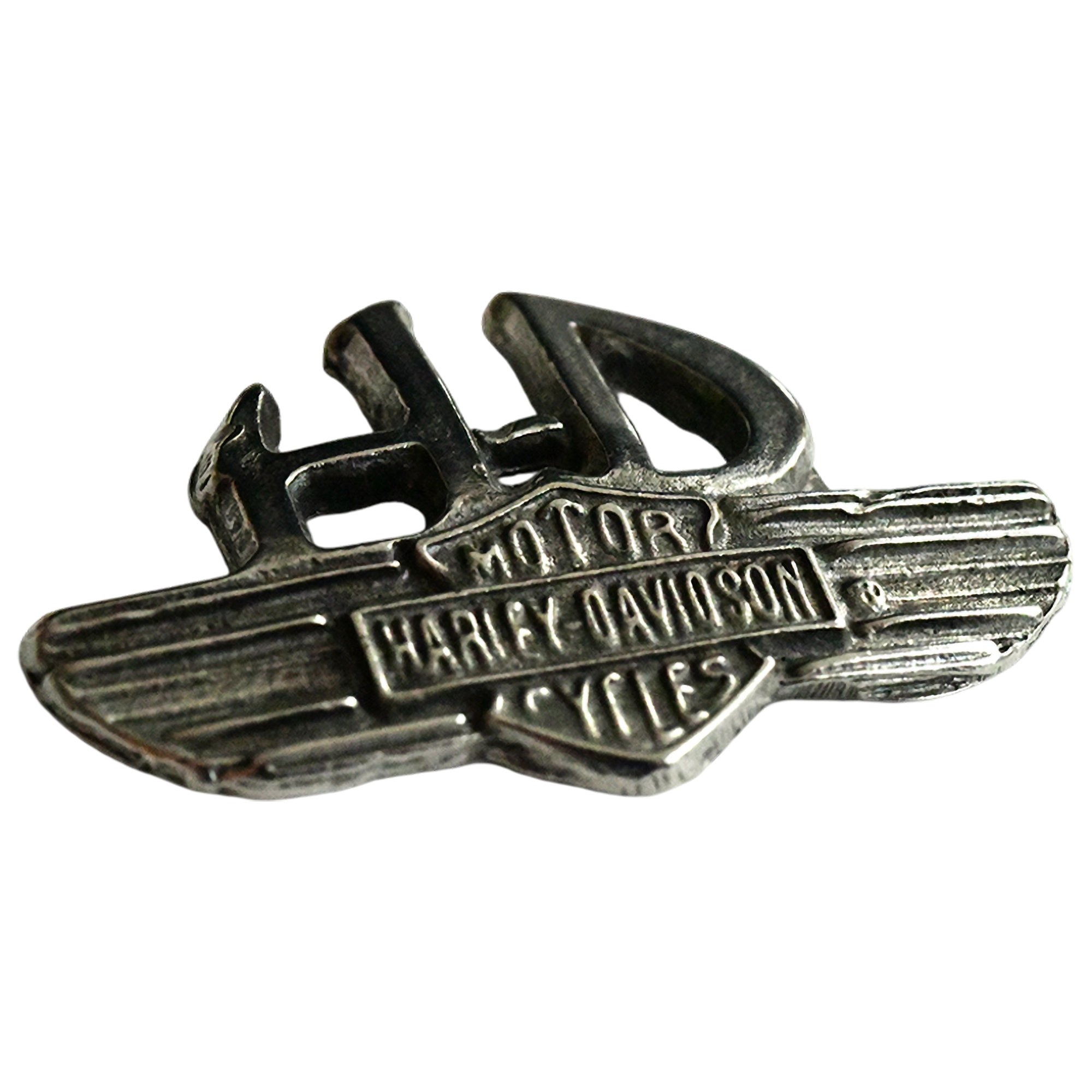 Este pin presenta el emblema Harley-Davidson: siglas HD sobre barra y escudo con alas, metal plateado.