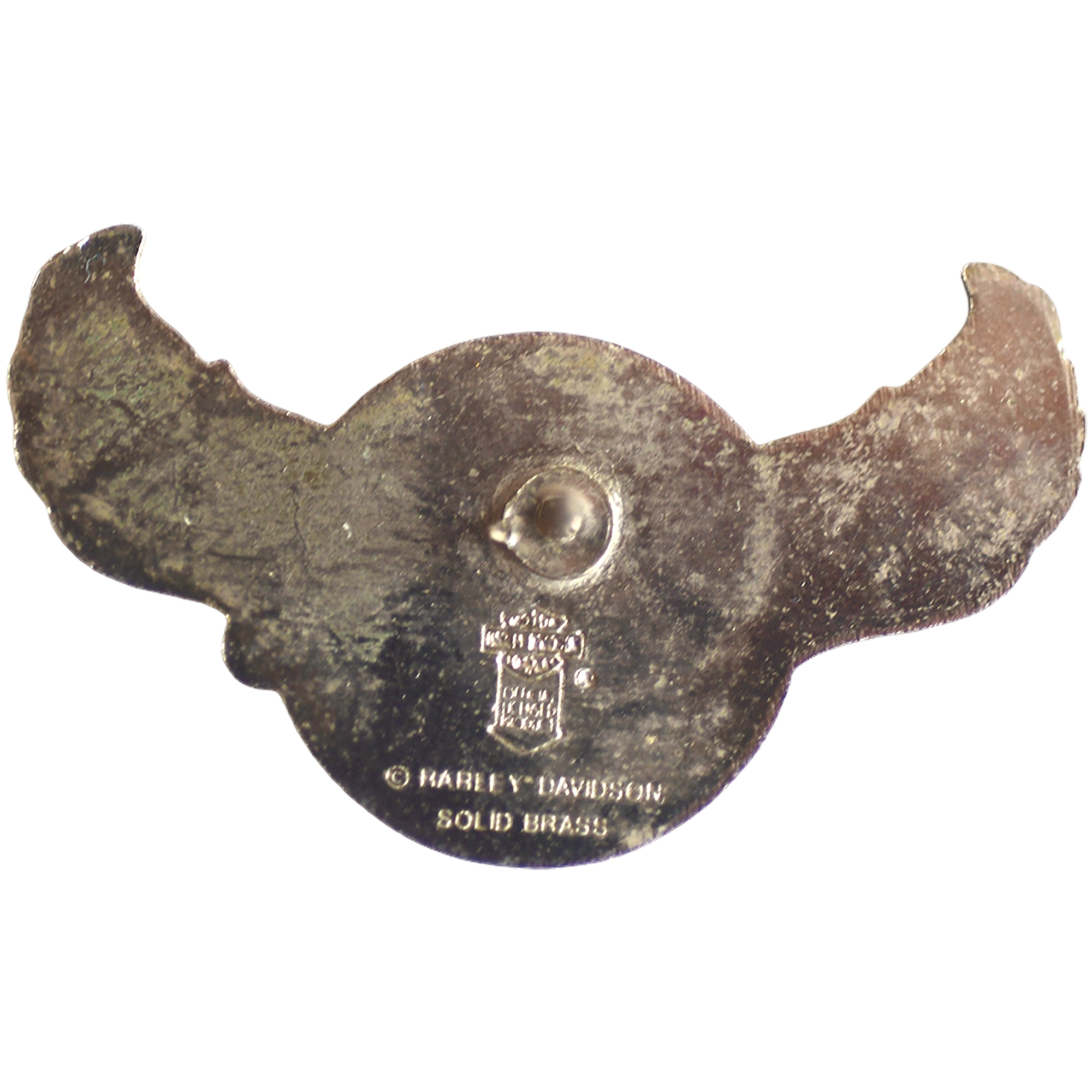 Este pin presenta el logotipo Harley‑Davidson en disco naranja con alas y el lema 'Nacido de sabiduría y dedicación'.