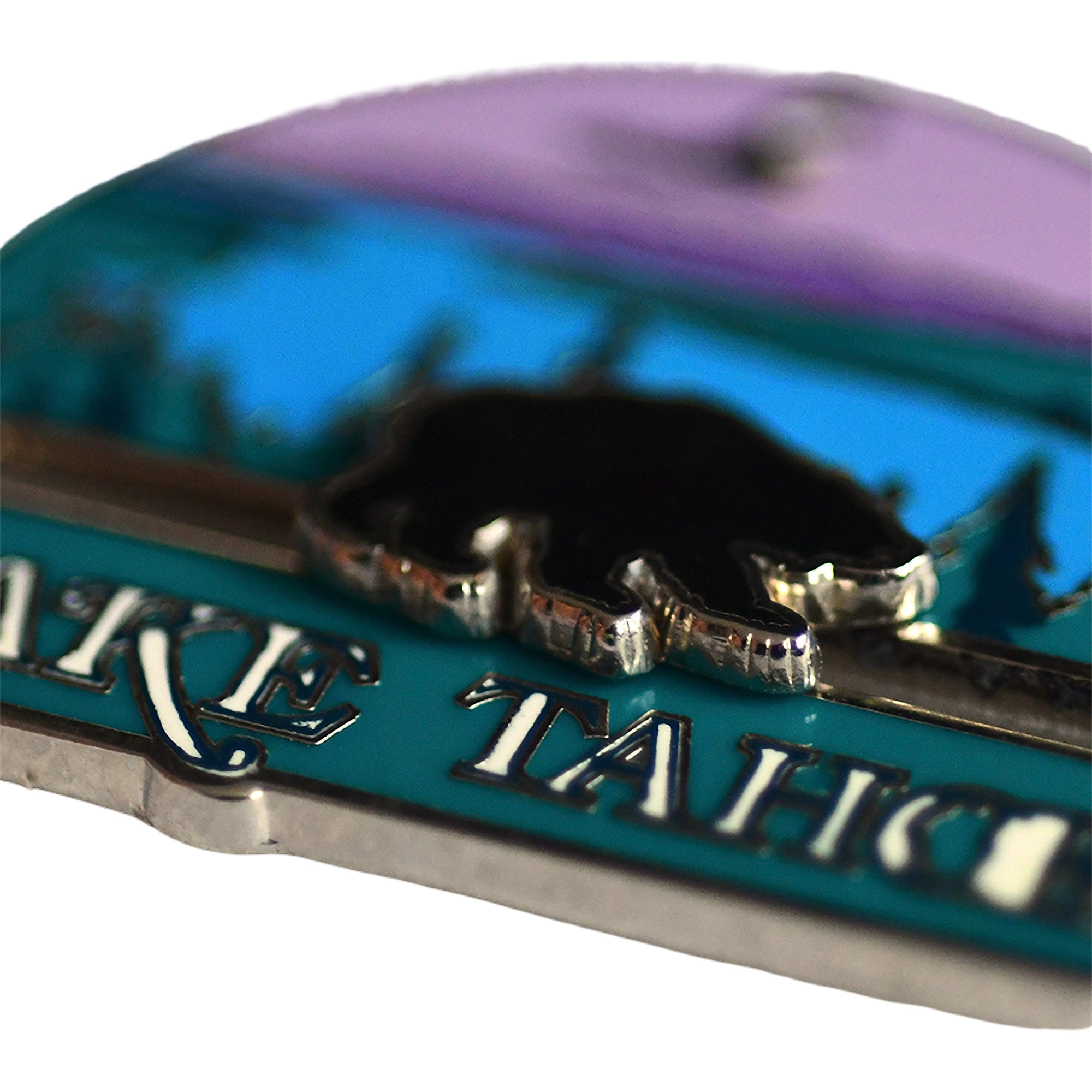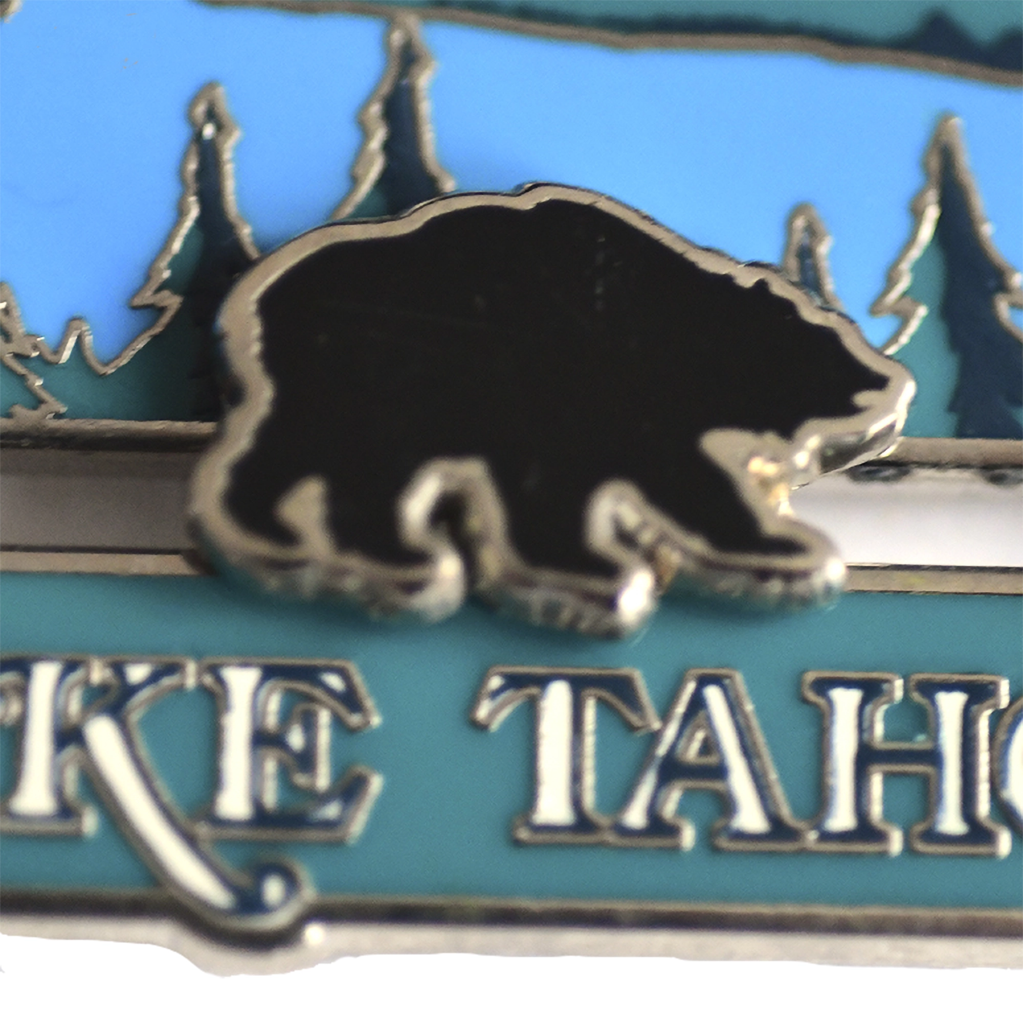 Este pin presenta el texto 'Lake Tahoe', paisaje lacustre con pinos y montañas, oso negro superpuesto y águila en vuelo.