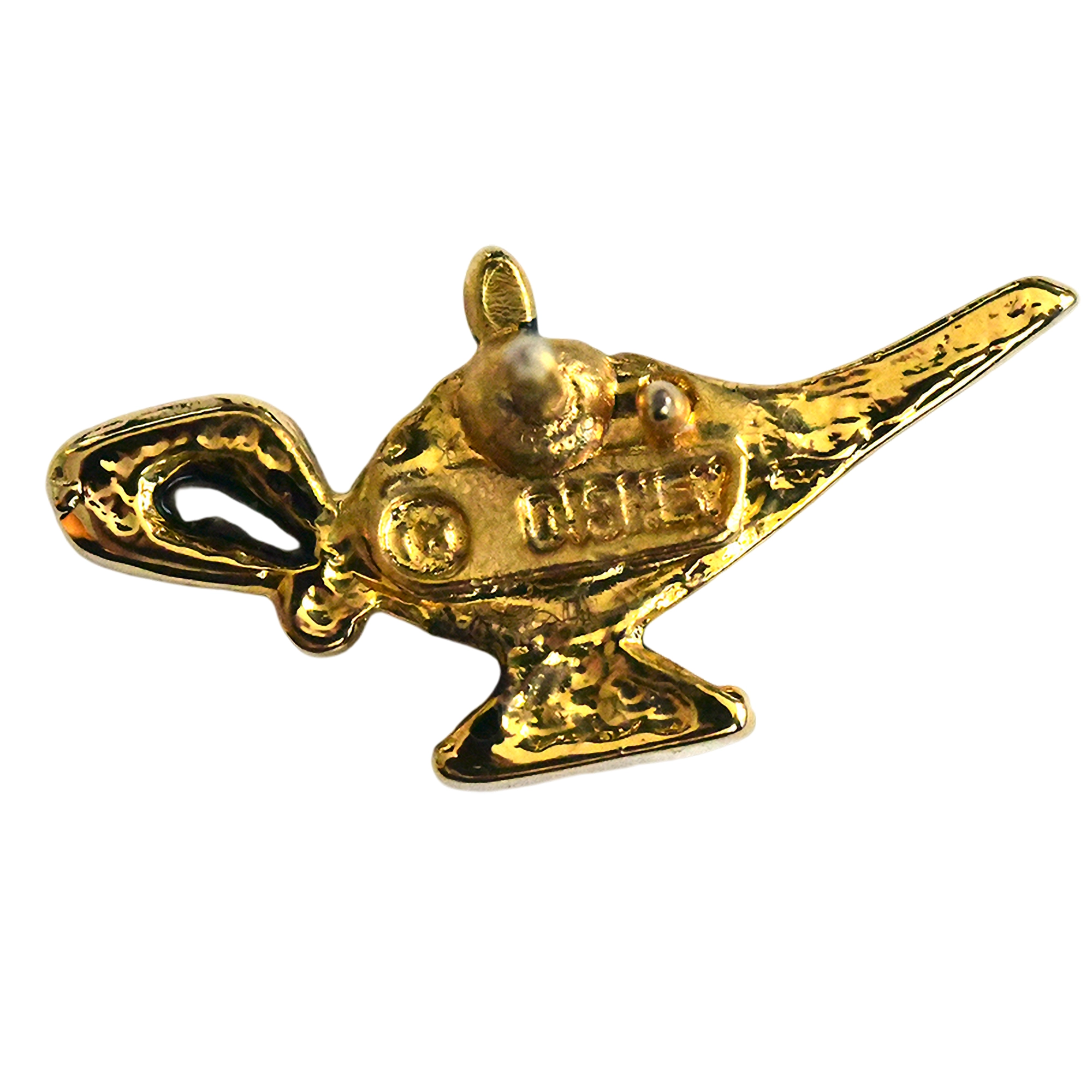 Este pin presenta la lámpara mágica dorada de Aladdín, silueta detallada con asas y tapa ornamentada.