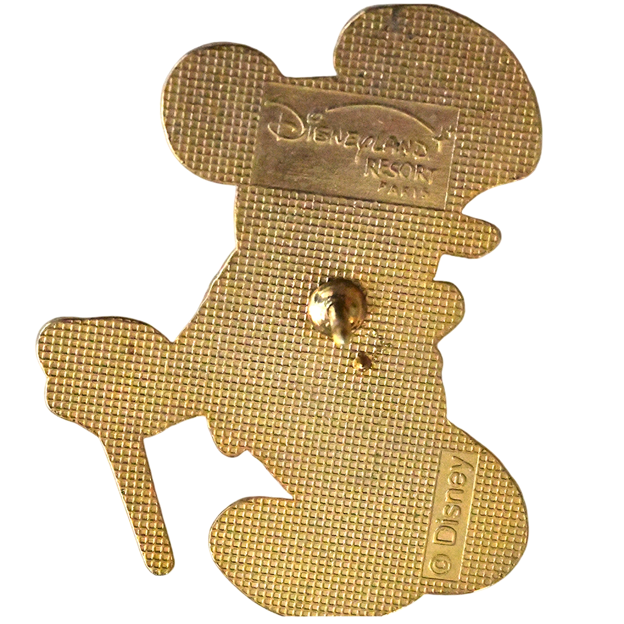 Este pin presenta a Mickey Mouse con frac azul, chaleco gris, pajarita roja glitter, sombrero de copa y bastón.