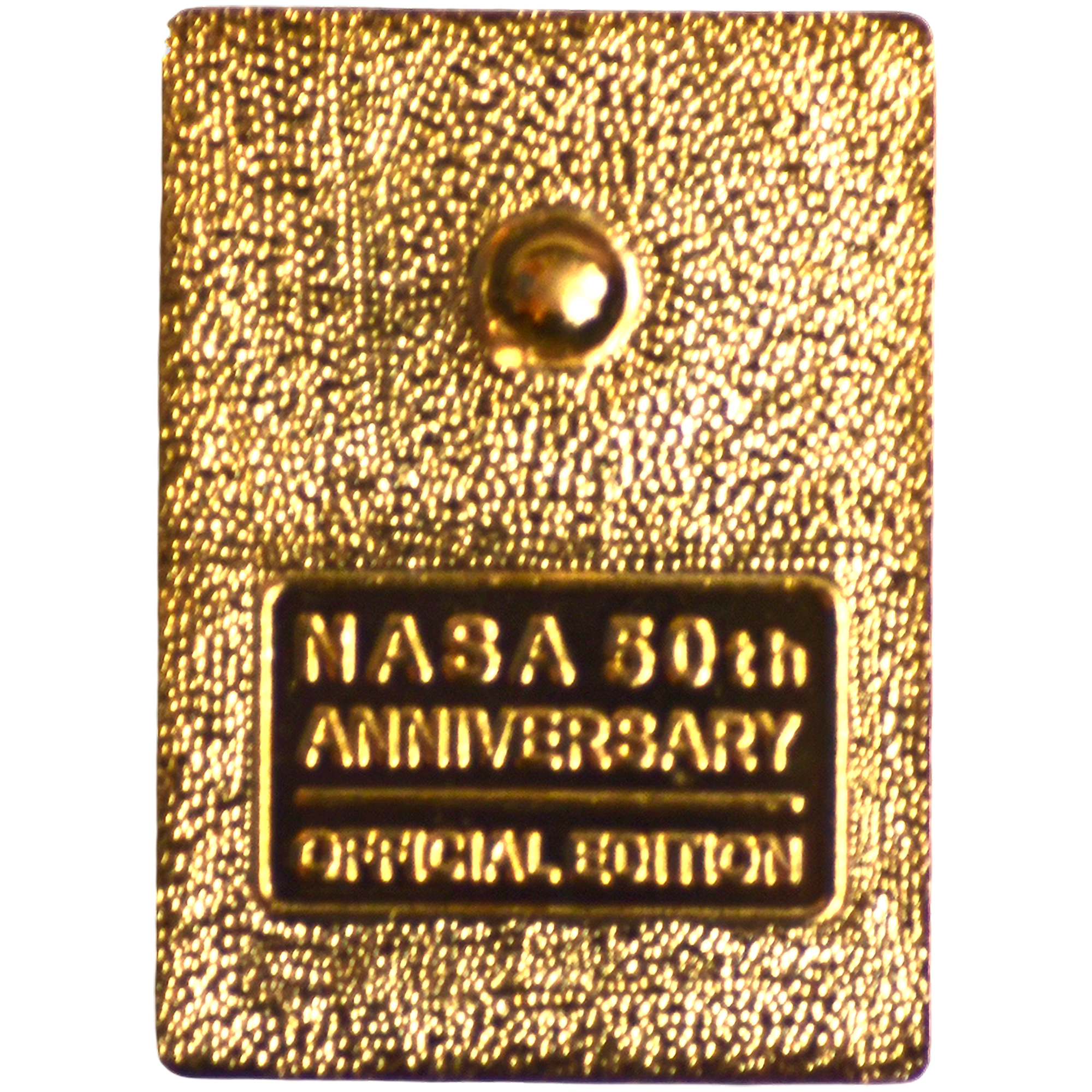 Este pin presenta el motivo '50 Years' de la NASA: número 50 sobre un eclipse estelar, estrellas y el logotipo NASA ('meatball').