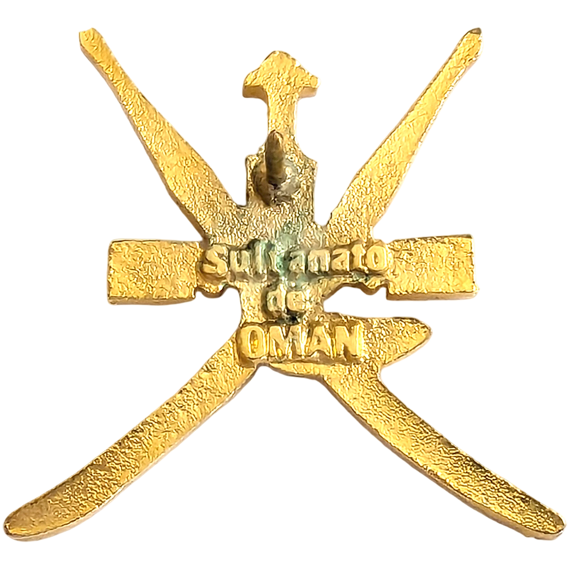 Este pin presenta el khanjar omaní sobre dos sables cruzados en acabado dorado, emblema de Omán (Expo 92).