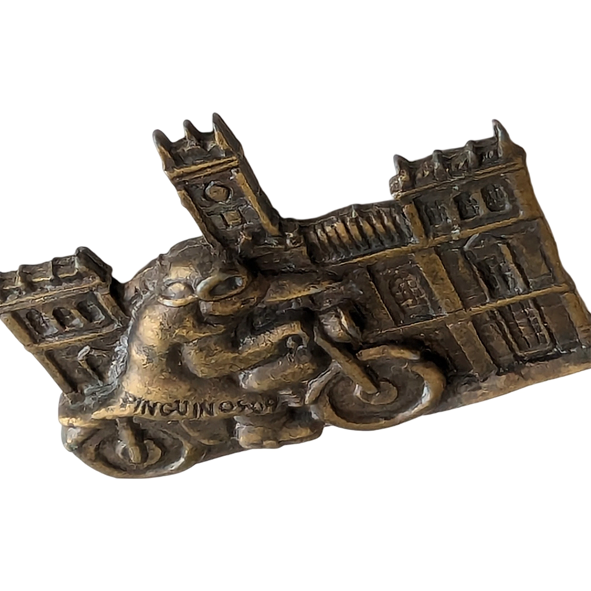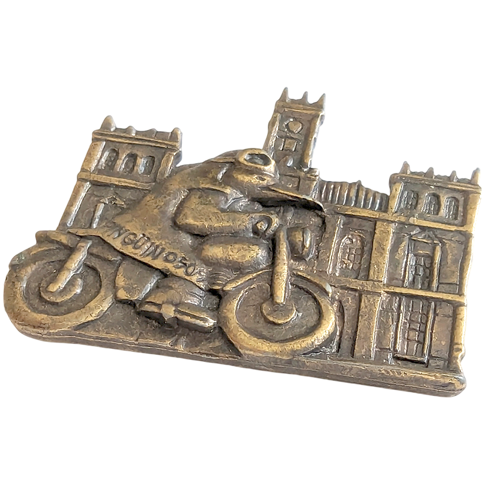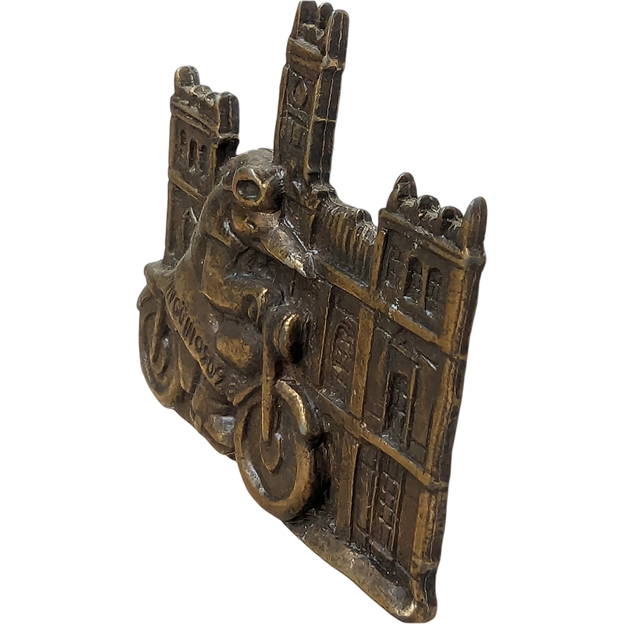 Este pin presenta a un motorista con capa en moto ante fachada con torre, metal envejecido y referencia a Concentración.