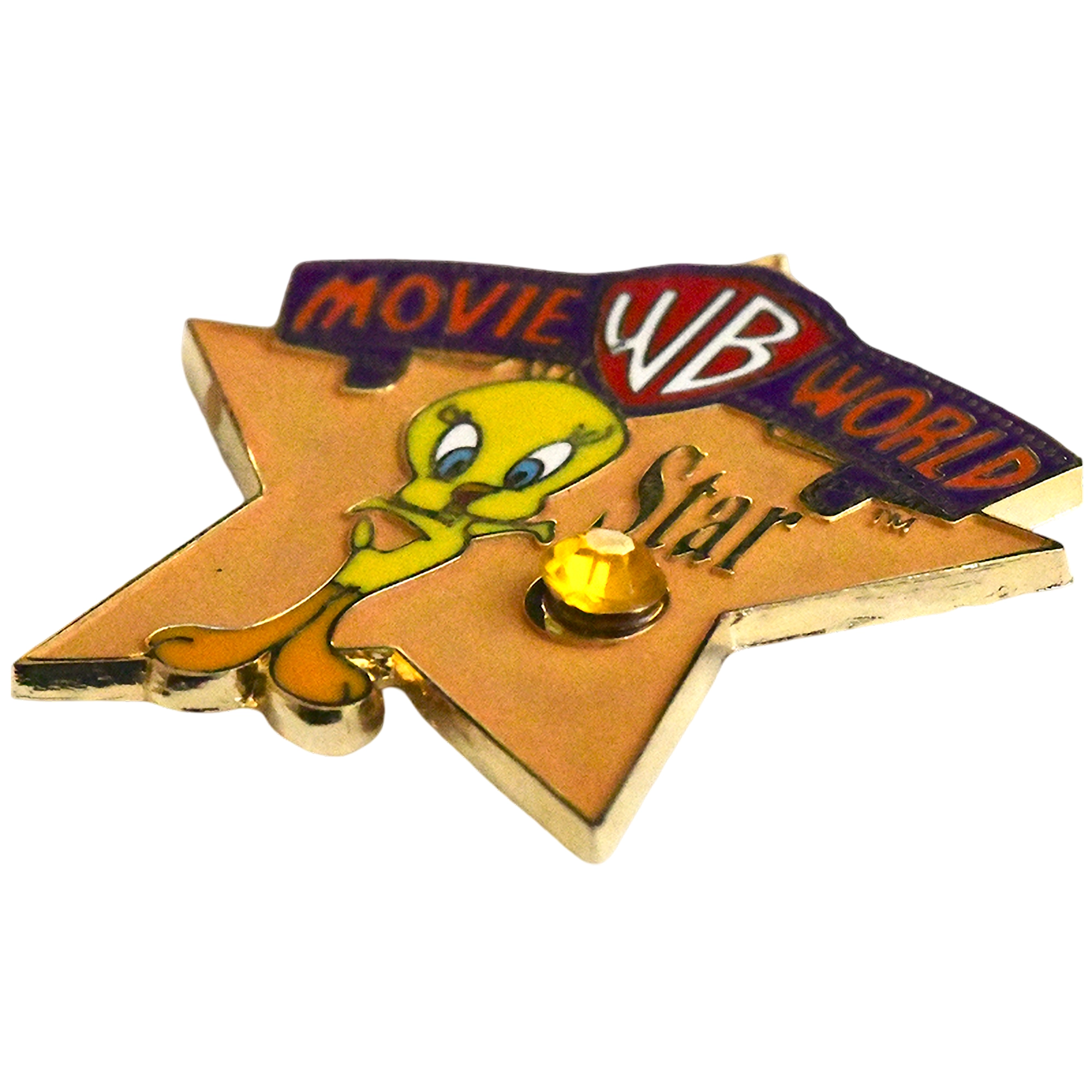 Este pin presenta a Piolín (Looney Tunes) sobre una estrella Movie WB World con gema ámbar y detalles dorados.