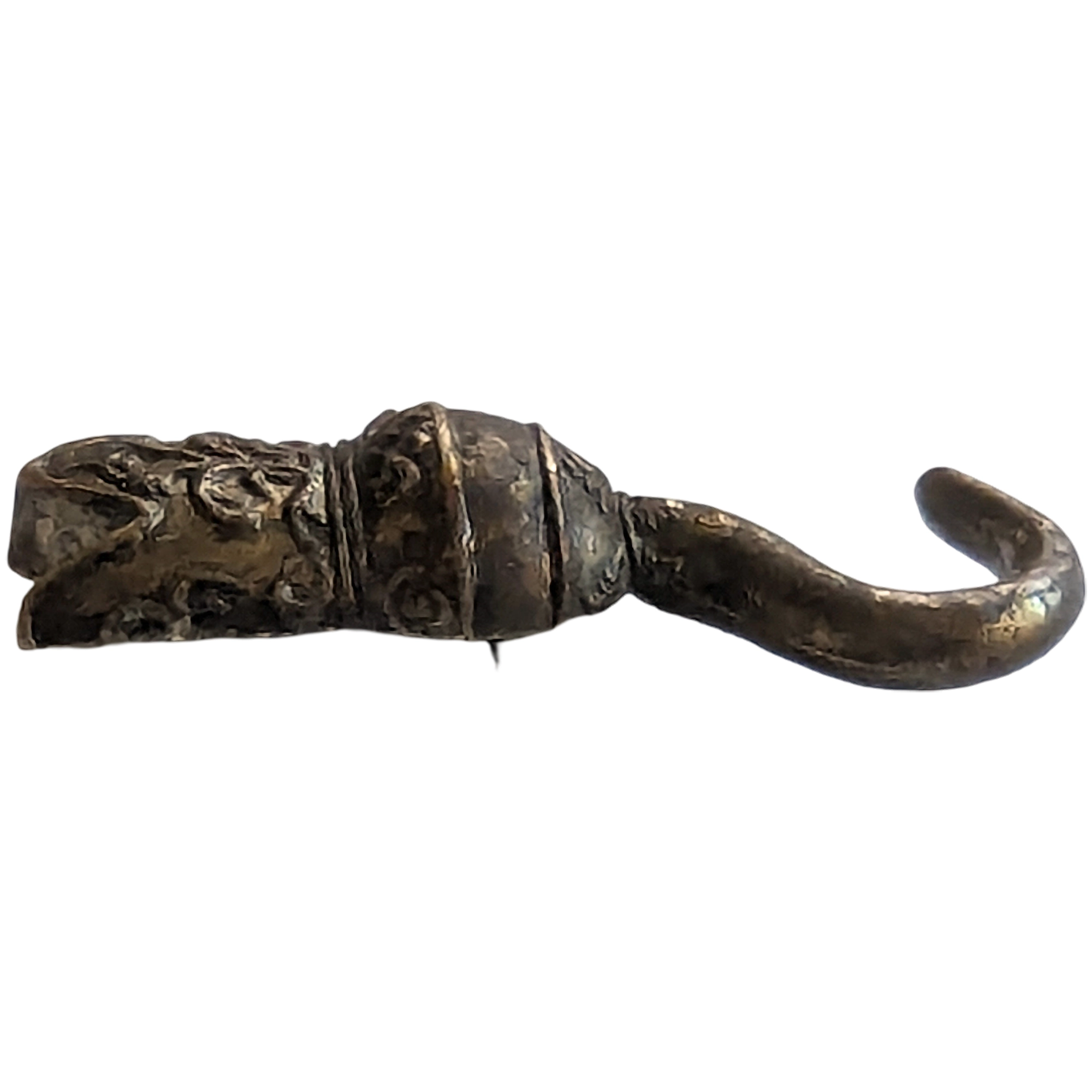 Este pin presenta un garfio metálico con puño en forma de corona, evocando al Capitán Garfio (Peter Pan).