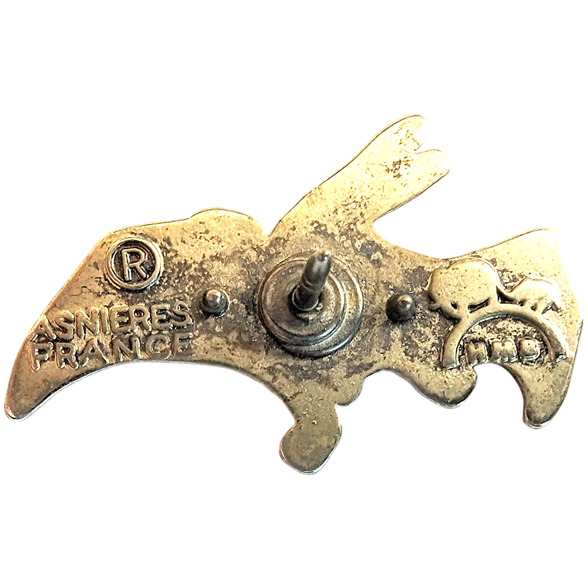 Este pin presenta a un pteranodón con cresta naranja, alas amarillas y contorno metálico plateado.