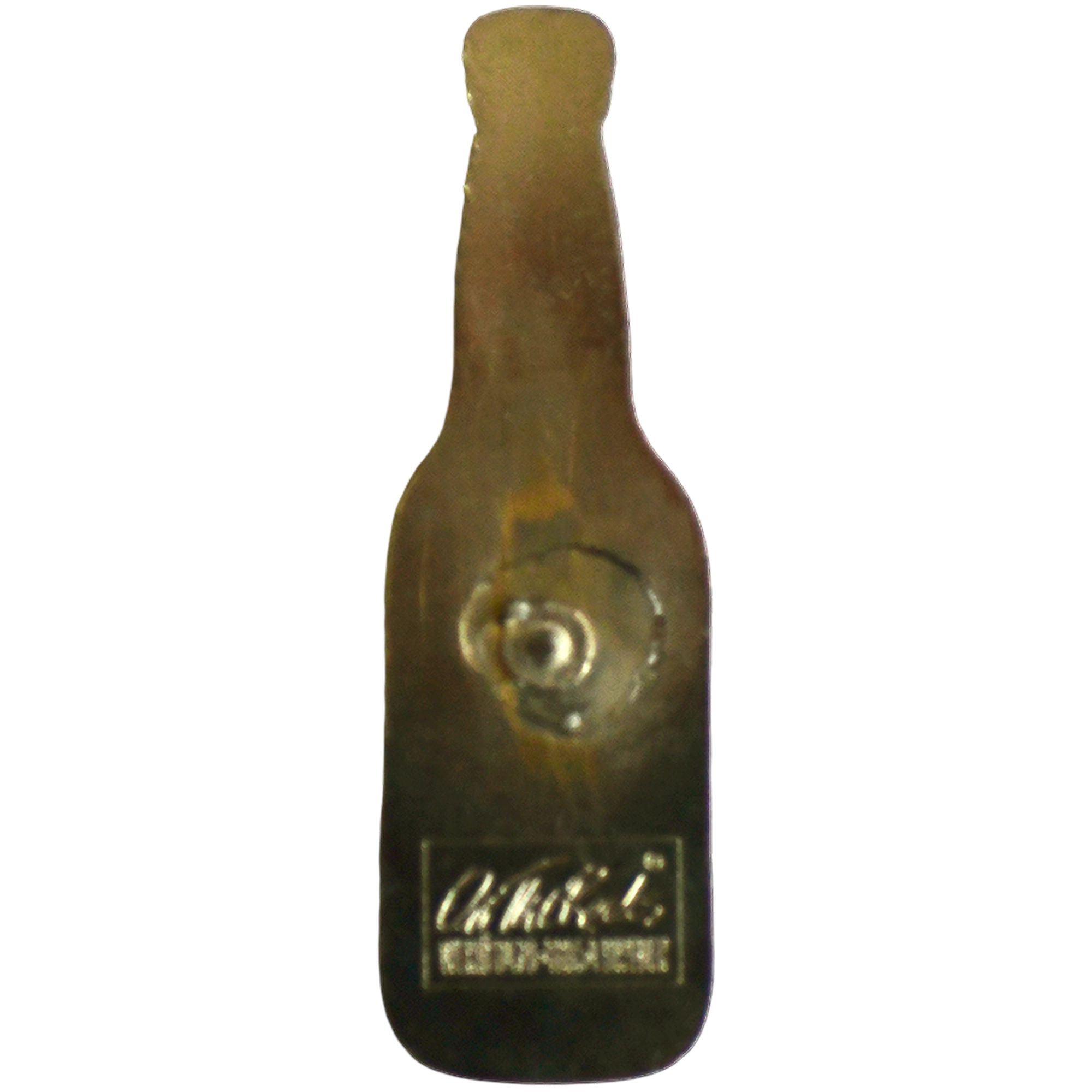 Este pin presenta una botella de cerveza rubia con chapa gris y etiqueta retro con texto 'Sol', rótulo rojo y detalle 33cl.