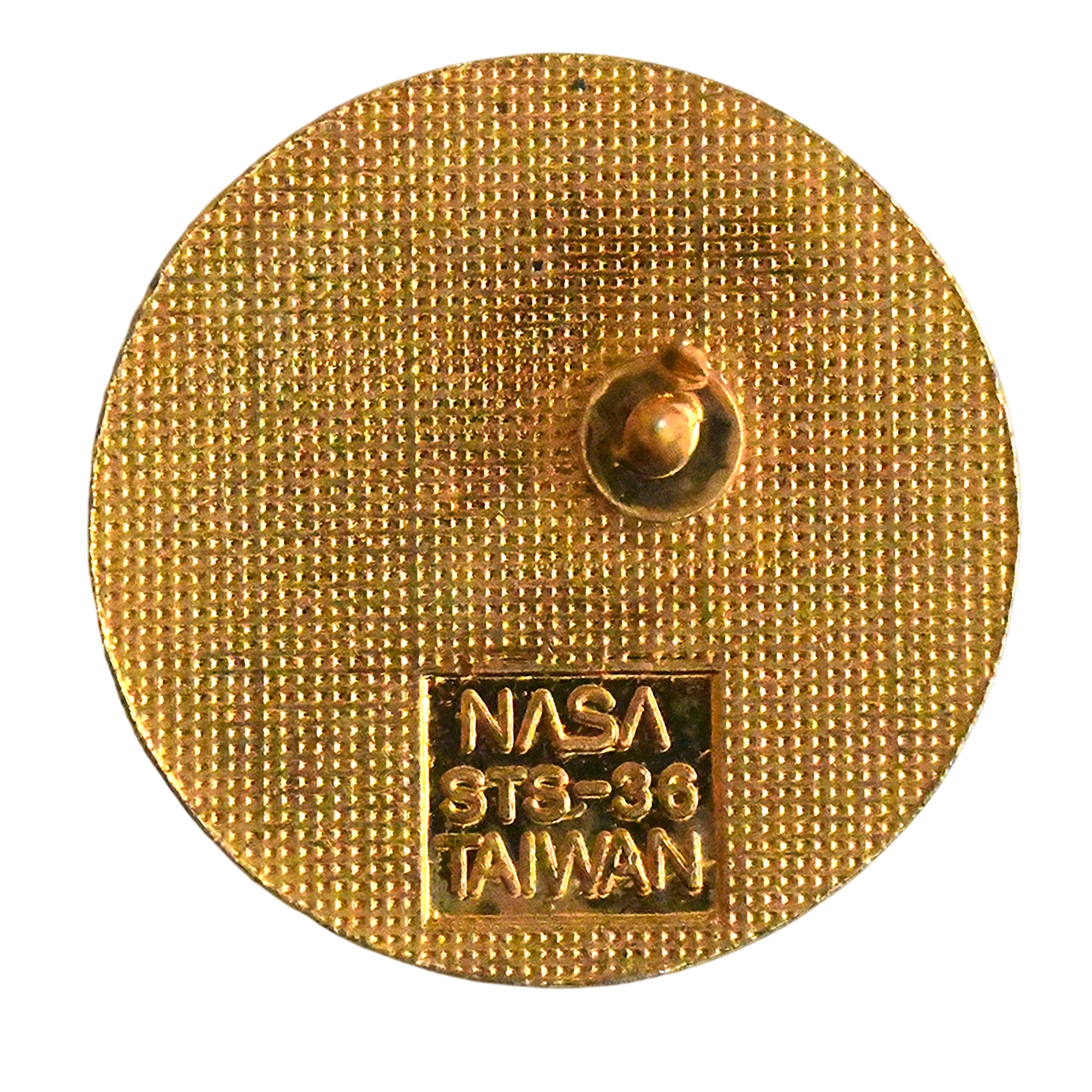 Este pin presenta el transbordador STS-36 lanzando con un águila y la bandera EEUU; borde con nombres de la tripulación.