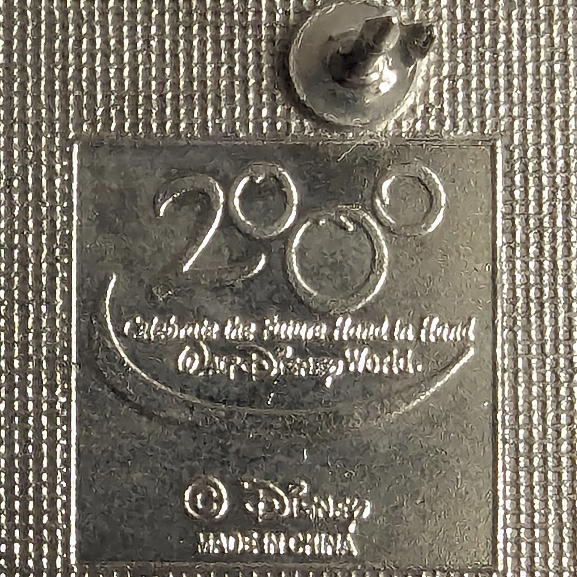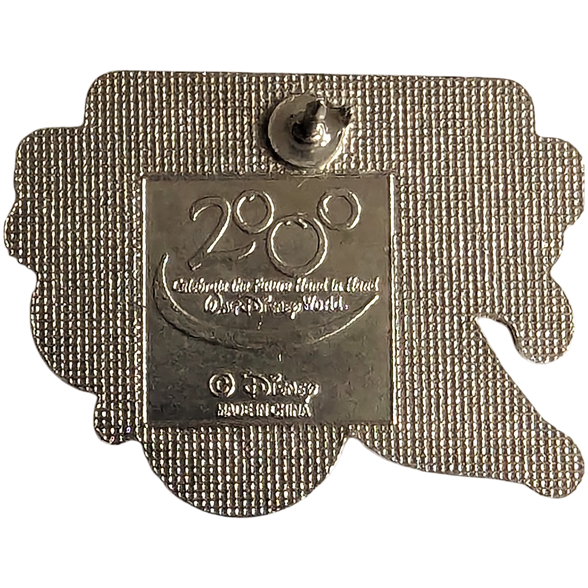 Este pin presenta logo Walt Disney World, lema 'Celebra el Futuro', 2000, dos figuras y aros color sobre fondo negro.