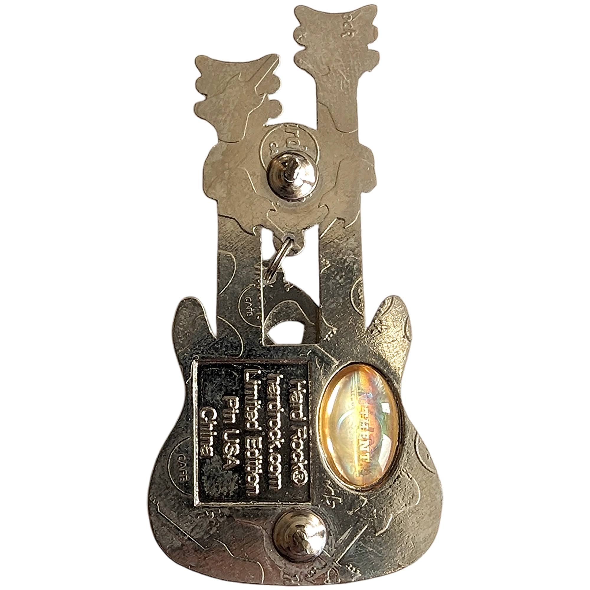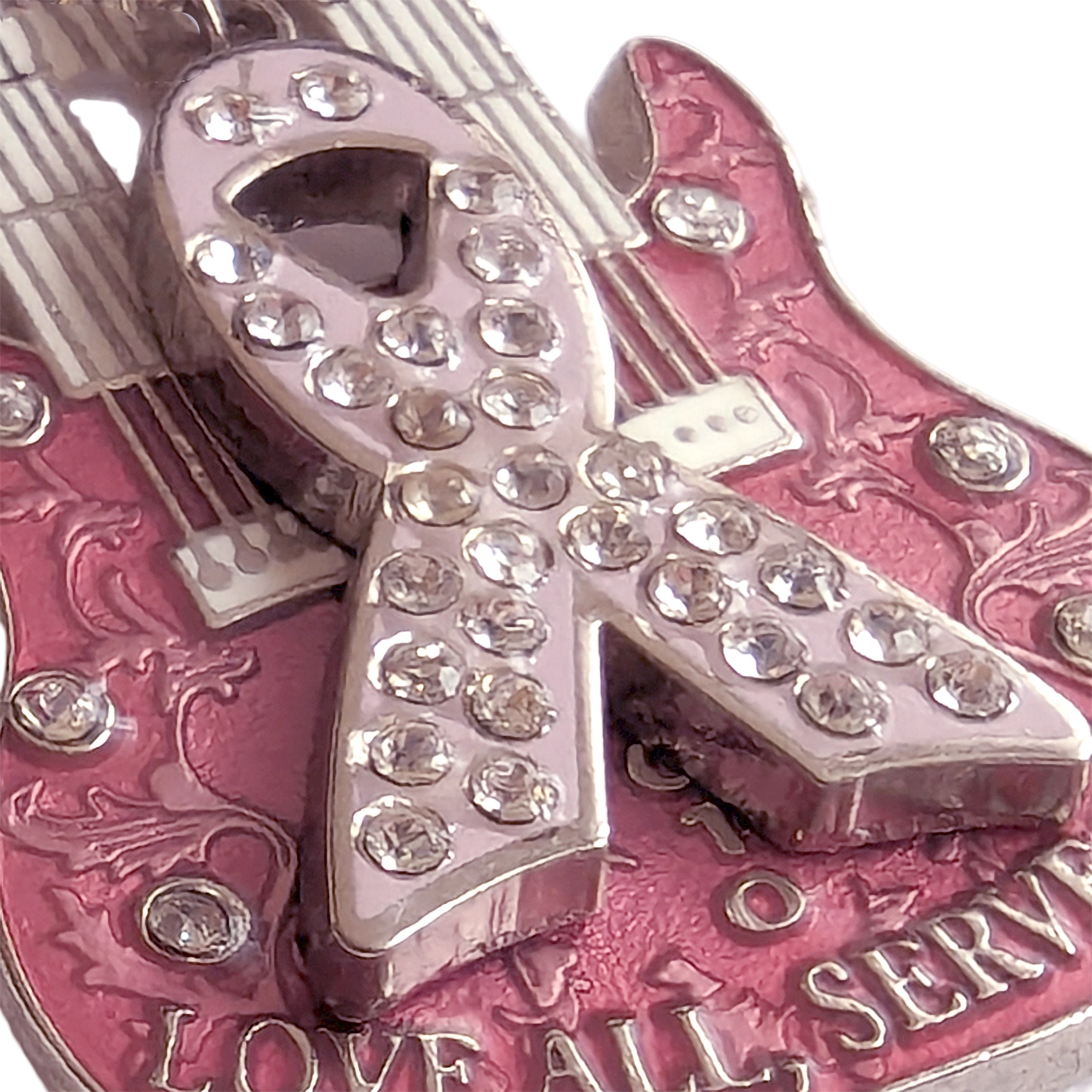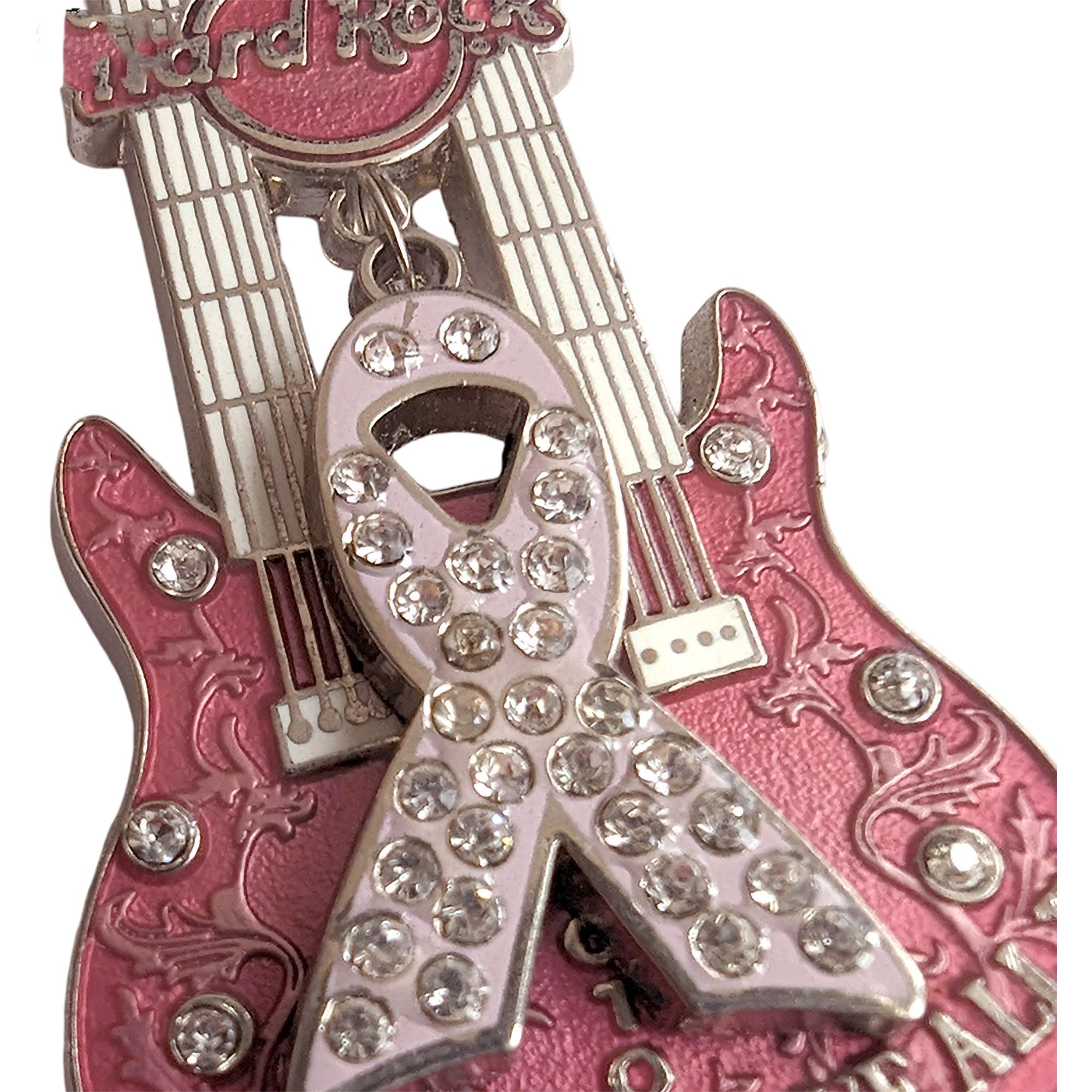 Este pin presenta una guitarra doble rosa con logo Hard Rock, lazo rosa con strass y lema Love All, Serve All.