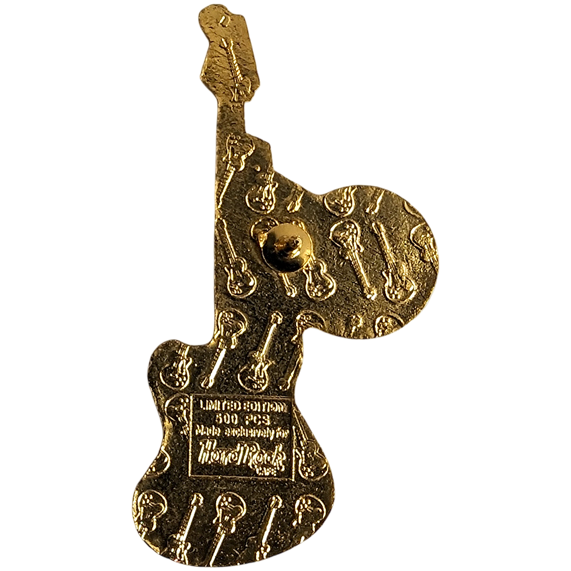 Este pin presenta guitarra dorada con logo Hard Rock Café azul, Cancún en el mástil y adorno circular.