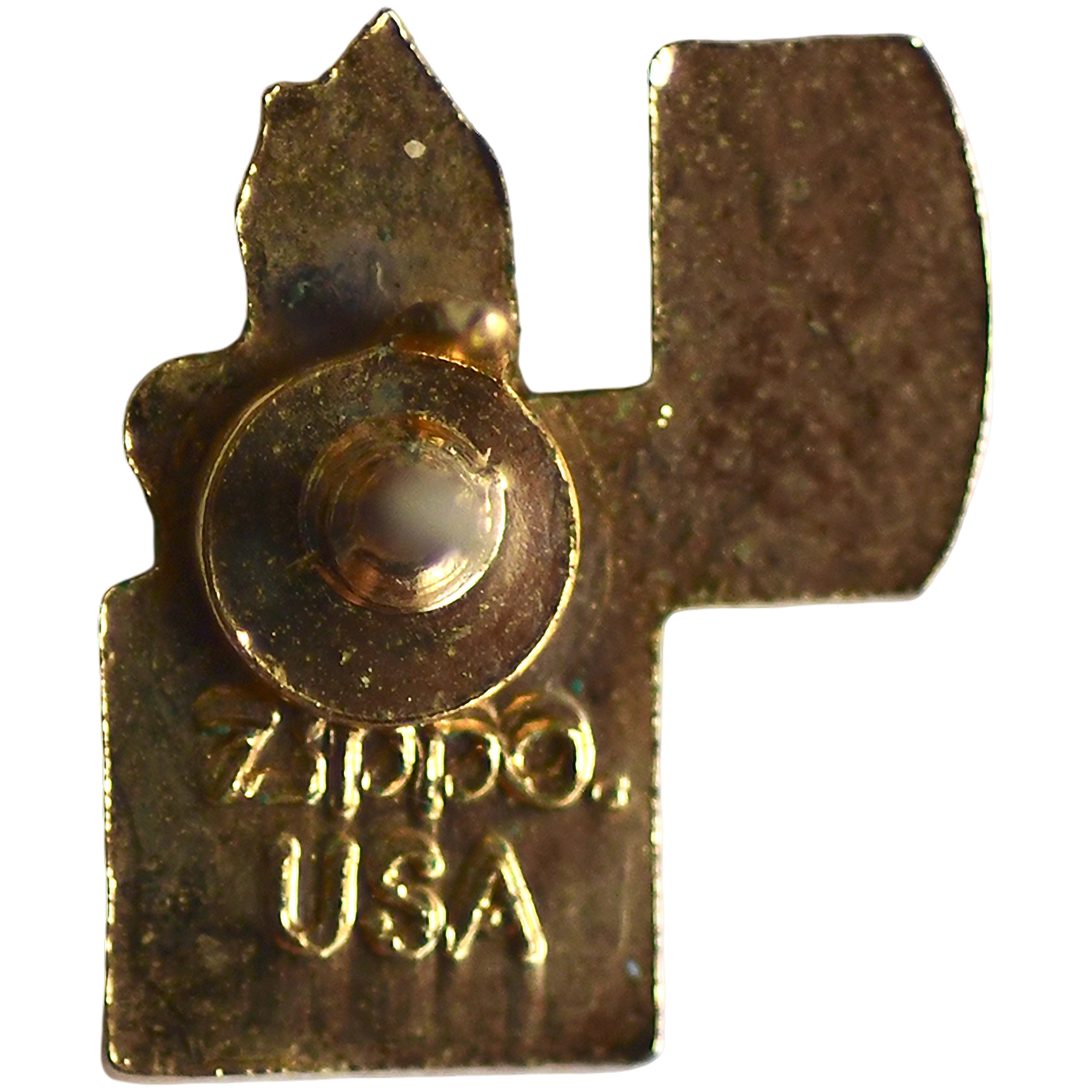 Este pin presenta un encendedor tipo Zippo con tapa abierta y llama roja esmaltada; acabado dorado y detalles grabados.
